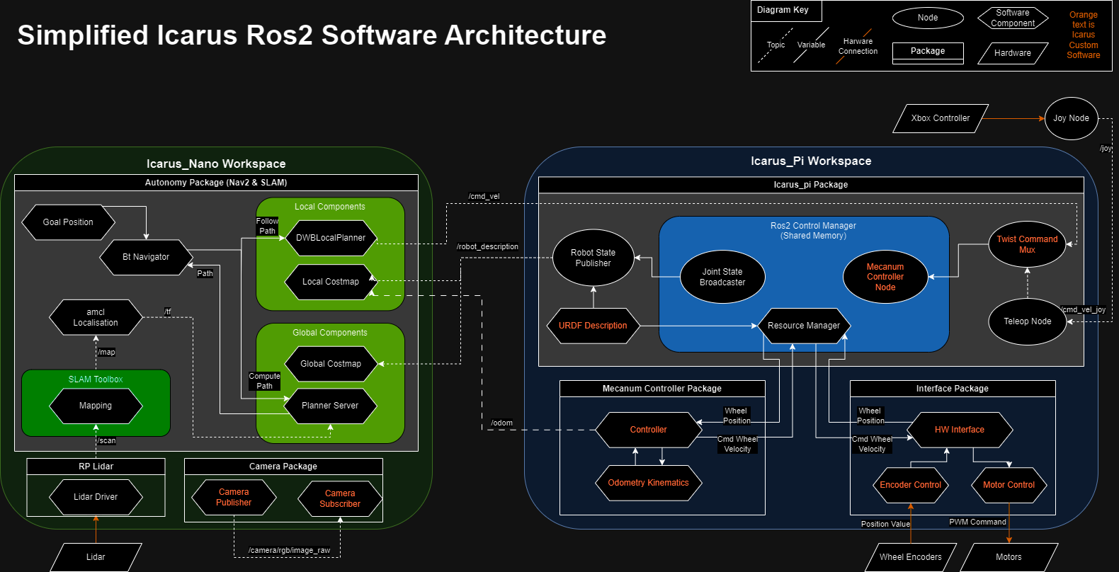 Icarus is a mecanum drive open-source project created for students or hobbyists to use as a base to gain experience with ROS2, Lidar, SLAM, and autonomous navigation and control.